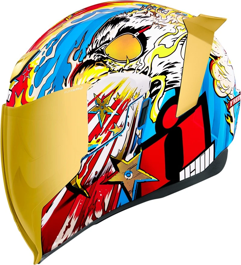 The ICON Airflite™ Freedom Spitter Helmet is the perfect choice for riders who want to stay safe and look stylish. This full-face helmet features a lightweight composite shell construction, a removable and washable HydraDry™ moisture-wicking liner, and an adjustable forehead vent for maximum airflow. The Freedom Spitter also has an integrated speaker pockets and a removable peak visor for added protection. With its sleek design and superior protection, the ICON Airflite™ Freedom Spitter Helmet is the perfect choice for any rider. Get yours today at Discount Moto Gear and save