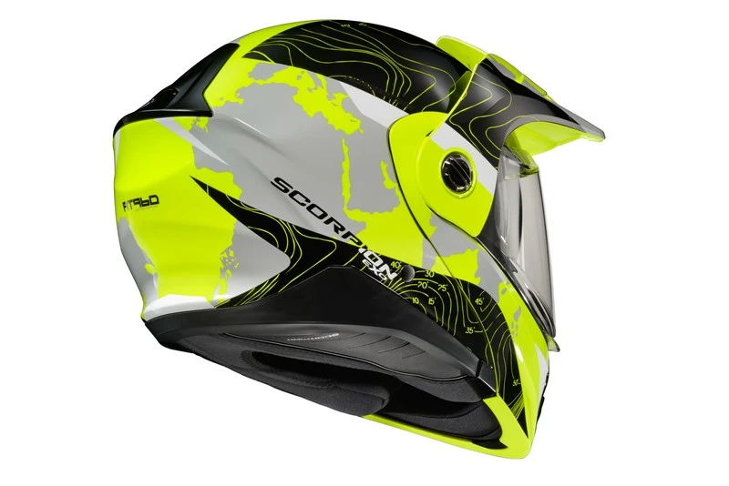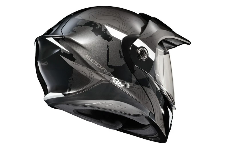 The EXO-AT960 Modular Helmet has evolved from one of the most popular Adventure Motorcycle helmets on the market; the EXO-AT950. Maintaining its high value (in addition to U.S. DOT Certification), ScorpionEXO has now added the latest ECE 22.06 Safety Rating, which requires a wider range of testing than the previous 22.05 certification. The EXO-AT960 can be used as a full face ADV helmet with external peak visor attached, or the peak visor can be removed for a more aerodynamic touring helmet. The oversized eye port is extremely wide for greater peripheral vision and downward visibility, and the modular chin bar can be conveniently flipped up. The internal drop down Speedview® sun-visor allows you to adjust to changing lighting conditions throughout the day. Additionally, the no-fog Everclear® face shield can be removed and you can use the EXO- AT960 with goggles for off-road use. Three shell sizes made of Advanced LG® Polycarbonate and dual density EPS, result in a helmet that is light weight, strong, and protective. And for those who need to stay connected, the EXO-AT960 was specifically designed to integrate with the new EXO-COM® BlueTooth® Communicator Kit while the large speaker pockets also make it compatible with many other com systems in the market.
